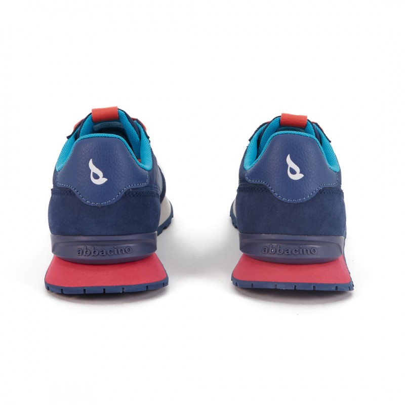 Sportowe sneakersy Abbacino w granatowym kolorze z koralowymi sznurowadłami i turkusową wyściółką. Łączą miejski styl z wygodą noszenia. Z kolekcji Wiosna-Lato, wyposażone w wyjmowane wkładki i geometryczną podeszwę, idealne do codziennych, kolorowych stylizacji.